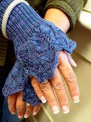 These fine, nearly-weightless wristlets in two sizes (S/L) feature a frill of pretty leaf motifs that are highlighted all around in yarnovers, to add a bit of feminine interest at the edge of a sleeve, while shutting out chilly winds. These cuffs make excellent use of yarn left over from larger lace projects and a great matching accessory for a shawl or scarf. Substituting yarn and/or needles may result in an overall variation in size.