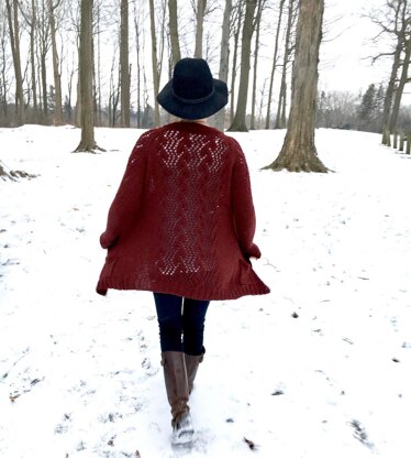 This lace back cardigan is worked from the bottom up, back, fronts and sleeves are worked separately then joined in a union round at the underarm. The yoke is worked in a single piece, with Raglan decreases shaping the shoulders.