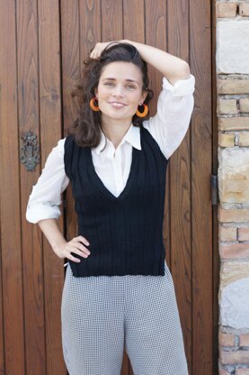 VINZERIA MERINO SLIPOVER - a smart sleeveless top/waistcoat in wool in a large ribbed pattern. To work in rounds until the split mid front. This low cut split you can close with a brooch or a button. The small splits each side are giving the model an elegant look. You can use the model alone as a woollen top or over a shirt - as you wish.