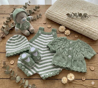 This pretty little set comprises of a cardigan, Romper, Sun hat and little shoes. The cardigan is knitted from the top down on straight needles. The Romper is knitted in two pieces and sewn down the sides. The hat and little shoes complete the set. The instructions are simple to follow and comes with line by line instructions