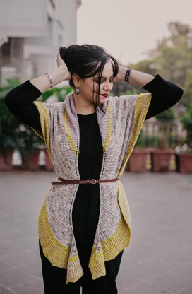 This is a crescent shaped shawl made with 3 colours. The body of the shawl is mostly twisted rib stitches with a combination of little stitch patterns to create the textures. The border is worked with two-colour brioche and uses basic brioche increase and decrease sts.