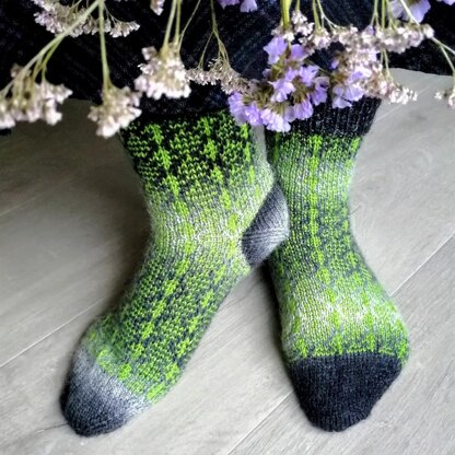 The Vurr sock pattern features subtle mosaic colourwork which works up quickly and is easily memorable. I called the pattern Vurr because it knits up fast and the motif reminds me of a spinning top which is “vurr” in my native Estonian. Mosaic knitting is one of the easiest colourwork techniques. The mosaic pattern knits up using just one of the yarns at a time. The remaining yarn is left hanging at the beginning of the round. Knitting involves slipping the stitches in a round that should be the "other" colour.
