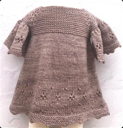 Top down construction, buttoned back, with flutter sleeves and an A-line skirt.