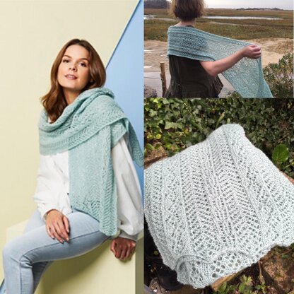 This wrap is knitted in two pieces and grafted together at the centre, so the ends will be symmetrical. If you aren't worried about symmetry, you can simply knit the whole wrap end-to-end. It features a pretty lace pattern which can be worked from the chart or written instructions, whichever you prefer.