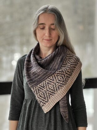 The Walk in the Dawn Shawl is an asymmetric triangular shawl with a mosaic border. The construction is worked from the right tip to the left mosaic border in one piece by increasing one stitch every second row. There are two versions of the shawl, which differ by the esthetics of the border. One option includes an elegant I-cord edge, the other a simplified garter stitch edge.