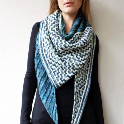 This bias-knit triangular shawl is combining the interplay of two colours with a bold & graphic mosaic stitch pattern, which creates an eyecatching effect.