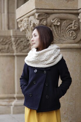 クルミの実をイメージしたアラン模様のスヌード。 長さがあるので、二重に巻いたり、フードのように使ったりと、フレキシブルに使えるのが嬉しい。薄いセーターに合わせれば、春まで使える作品です。