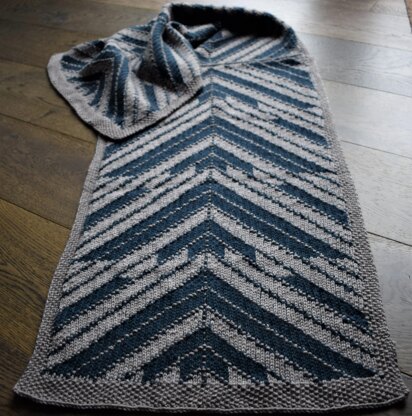 The wrap is knitted flat with 5mm (8US) needles. It starts from a provisional cast on in the center of the wrap and knit outwards until the cast off end. Then the provisional cast on stitches are picked up and knit outwards so that the right and left sides of the wrap are identical.