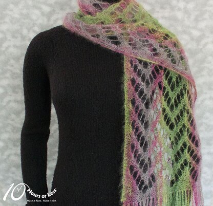 Turn a single skein of laceweight yarn into wispy, web-like fashion shawl! Knitted in one piece, the airy openwork boasts extended yarn-overs and a novel decrease technique to create a surprisingly stable feather-light fabric. Edged with optional knitted fringe, this understated accessory lends equally to casual or formal wear. And with our step-by-step instructions for making any size in any weight of yarn, you can knit an array of gossamer goods…..from a narrow neck scarf to a voluminous wrap!