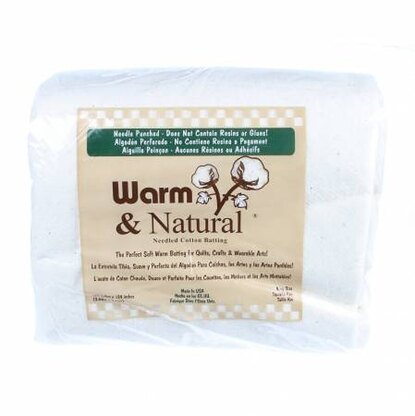 Warm & Natural is the finest needle-punched cotton batting! This soft, natural cotton has never been washed or bleached with harsh chemicals. It's kinder to the environment and kinder to your batting. The cotton undergoes a mechanical cleaning process removing all of the seeds, seed coats, along with the majority of leaf and stem remnants. The remaining tiny plant particles lend a special look to crafts like no other and won't harm your quilt.\n\nQuilt or tie up to 10" apart! Quilt Warm & Natural right out of the package, as pre-washing is not necessary. Once quilted, machine wash and dry your finished quilt in cold water. 3% shrinkage can be expected in the first wash with cold water. To achieve an antique puckered look use warm water for 5% shrinkage. Warm & Natural won't distort when hanging, hooping or when used in quilt frames.