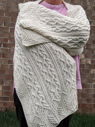 If you love knitting cables, you’ll enjoy this shawl made using light worsted weight yarn, guaranteeing that you’ll be warm. The patch pockets ensure that the shawl will stay put on your shoulders. The patch pockets are optional as they are placed on last.