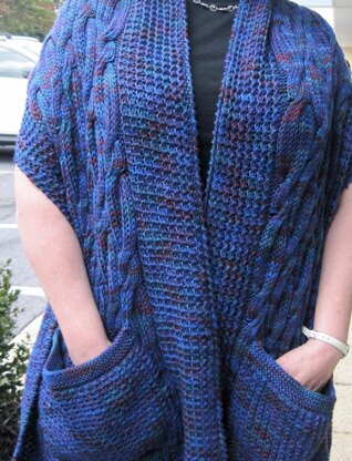 The shawl is made using worsted weight yarn, and hence is very warm. The pockets insure that your shawl stays on your shoulders.