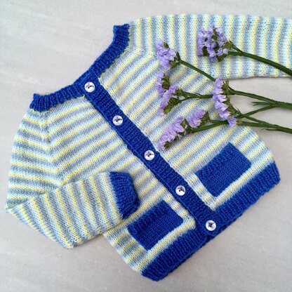 Presenting the first in a series of free basic patterns….Watch the Birdie! Adorable bluebird buttons bring the fun factor to this simple striped cardigan.