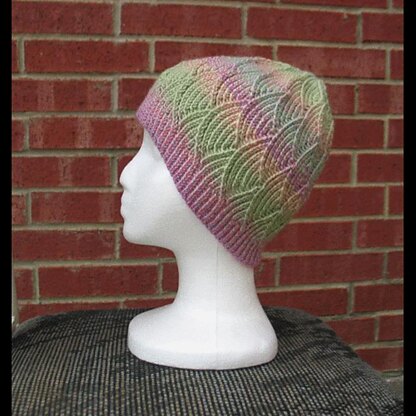 Water Lily hat is knit-in-the-round from the ribbing to the crown in a simple but lovely symmetrical ripple stitch reminiscent of fish scales or waves. Hat measures 19" circumference at the bottom and 8" high.