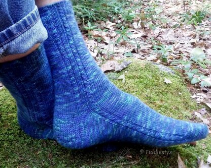 The cables that cascade down the sides of these comfy socks remind me of small spring snow-melt waterfalls in the woods near my home. Simple, with just enough details to amuse a knitter, these socks are a quick and satisfying project.