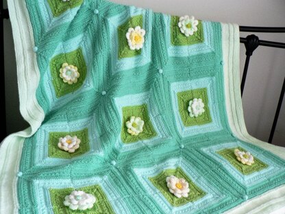 Waterlily is a patchwork effect blanket consisting of 48 individually knitted mitred squares which have been stitched together & embellished with separately worked floral motifs. I have knitted my blanket using Stylecraft Special DK yarn in soft shades of green but any of your favourite toning colours would work equally well. Alternatively, to highlight the contrasting stitch textures within the design, the blanket could just as effectively be knitted in a single colour if preferred.
