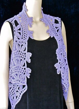 Wear the large rectangle in front and it’s a sleeveless top; wear it in back and it’s a vest. Wear it upside down for a trendy 'cocoon'-looking vest. Waterlily is a twist on 3 seamed rectangles; the sportweight yarn makes the Waterlily stitch pattern bold-looking without being overly dramatic or chunky.
