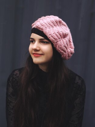 Elegant beret with classic feather and fan lace creating beautiful flowing texture. Optional contrasting edge and inner lining for reversible wear and extra warmth. Seamless construction.
