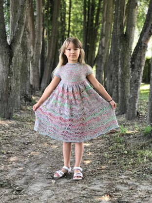 The Wave Dress for Little Miss is knitted using Rico Design Superba Bamboo Superwash yarn. It is a cosy, loose dress for any girl wishing to look like an inspiring fashionista, with easy stockinette and lace pattern. The dress features round neckline, flared skirt and short sleeves. It’s an easy to wear pull-on with a loose-fitting top. The skirt sits below the knees. You can make it knee length or even shorter- like a blouse or much longer- maxi. Just stop knitting when you reach your desired length. For this seamless dress, knitted top down, you begin with the neck. As this dress is designed with a simple neckline, it is very easy to start. The neckline and sleeves of the dress are finished in the same rolled edge.