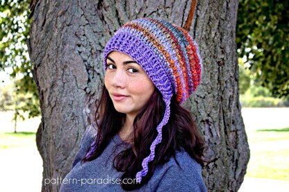 This pretty hat is quick and easy to make -- the yarn does all the work. Add pompoms to the ties if you like for a fun finish.