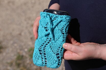 Ein einfaches Lacemuster mit Ruherunden ergibt diese süsse Handyhülle. Sie ist in weniger als zwei Stunden gemacht, also perfekt für Geschenke in der letzten Minute. Vielen Dank an meine Techeditorin Michelle Hazell und meine Teststrickerinnen!