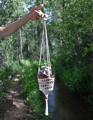 - finished hanger circumference measures approximately 12.25" at the base and 15.5" at the top - finished height measures approximately 9" (excluding straps and tassel) - written in US crochet terms - #4 medium weight yarn required - size US H/5mm crochet hook required - 3 - 10mm and 1 - 14mm wooden beads - key-ring - made for an approximately 4.75" flair pot