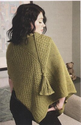 Worked sideways with increases down one side. This shawl design uses stocking stitch and a honeycomb pattern using twisted stitches. Finished with a tassel.