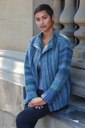 Finally the wait is over! To celebrate ten years of publication, Sandi Prosser has released a crochet version of her popular classic knitted Weekend Jacket. Worked in a combination of single and double crochet stitches, this version follows the same construction methods as its knit cousin to marry style and simplicity. The main body is worked from side-to-side so that the variegated yarn creates vertical stripes for a dramatic effect, while the alternating stitch pattern creates textural interest.