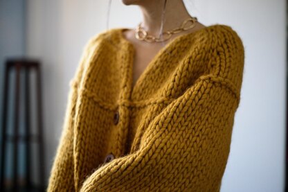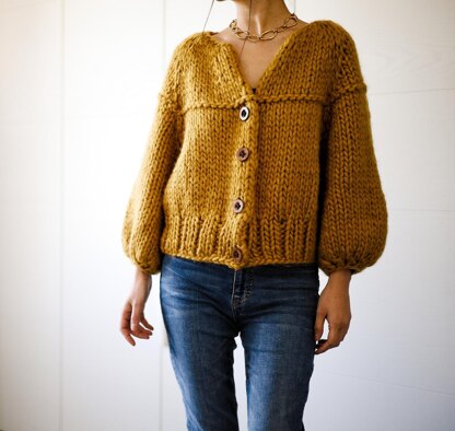 Weekend Jacket is a sweater worked in super bulky weight yarn to give a dramatic scale to this design. It features deep armholes and puff bracelet length sleeves. The pattern includes instructions for a long sleeve version.
