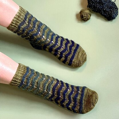Wellenreiter sind relativ Anfänger*innenfreundliche Socken mit plastisch hervorgehobenem Zick-Zack Muster über einem Lochmuster.
