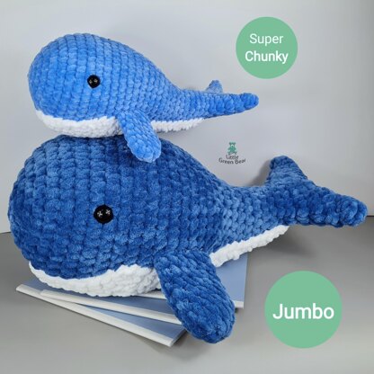 I’ve made Wesley the whale using a super chunky #6 weight plush yarn. This is ideal for a big soft and huggable toy and is a quick make, you can make your whale in a few hours. Wesley can be made with or without the white underside piece, you can decide. He is 12.5 inches long in super chunky weight yarn - 19.5" in jumbo - (when made with recommended materials).