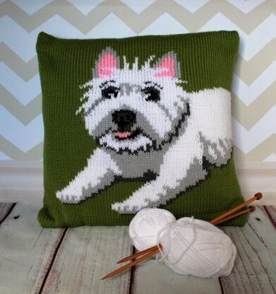 Knitted cushion cover pattern featuring a West Highland Terrier in a fun pop art style! This can be used to cover a cushion pad, or a box canvas if you’d prefer to display your hard work on the wall and have a unique piece of art!