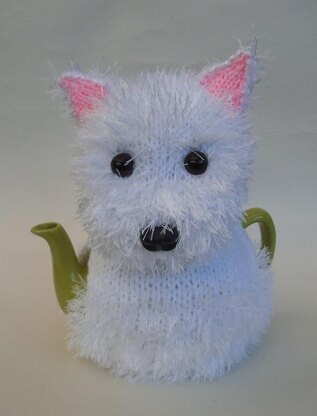 The pattern is knitted on two pins and is easy to follow and is mainly worked in stocking stitch. The Highland Terrier tea cosy knitting pattern is super warm two because it's knitted with double thickness wool, double knitting wool and Stylecraft Eskimo wool. The tea cosy fits a medium sized tea pot that covers a Teapot that holds 6 to 8 cups.