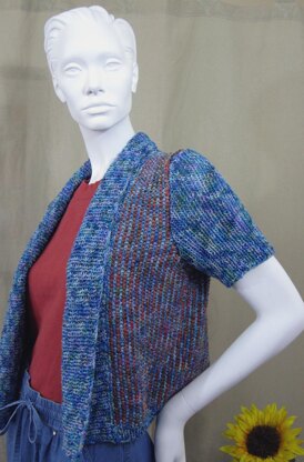 Use bright or subdued colors, this 2-color linen stitch open front cardigan has a great drape once blocked, and will be your go-to piece for any occasion. Worked in one piece from the bottom, the normally wrong side of the 2-color linen stitch forms vertical garter-looking stripes. Divide the body at the armholes and work each piece to the shoulders. With no front neck shaping, the work proceeds quickly. The sleeves are worked in k1, p1 rib and can be left unblocked for a snugger fitting sleeve. The collar is worked to a length to be folded back, but can easily made for a shorter, single layer.