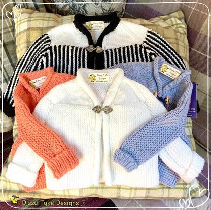 Knitted sideways this striking design would suit any baby and make a perfect baby shower gift. Secured with a simple loop or hook fastening there are no button holes. The yoke is knitted flat and short rows help form the seamless roll back neckline. The pattern has instructions so it can be knitted in one solid colour or 2 colour stripe.