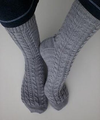 These socks feature a mirrored cable design with offset cable twists – this makes the socks stretchier than with usual cable designs. The center motive is accompanied by a subtle cable at each side, which shows its secret power on the gusset: the gusset decreases are integrated into the cable design and get “eaten” by the cable!