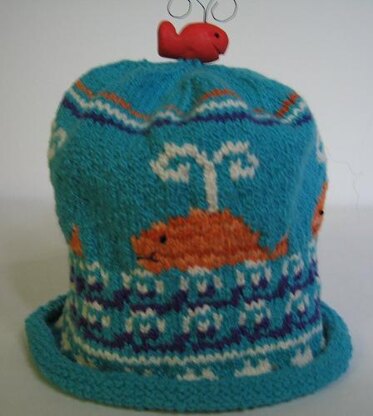 I always have way too much fun with Fair Isle. When I put the Fair Isle together with the Cascade Fixation yarn I fell in love. The bold colors combined with the Fair Isle design really make a cute baby hat. Once I finished the hat it was clear that it needed something to top it off, so I made a little whale with Fimo clay. Before I baked it I put a hole in the top. When he was finished baking I glued some blue wire in his spout and beads in his eyes. The matching booties a set.