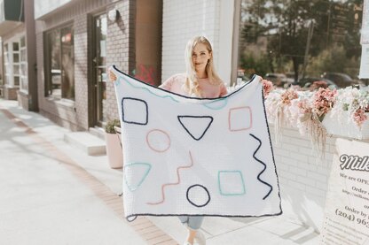 The inspiration behind this blanket was the retro, 90s-inspired geometric designs typical of this decade. The shapes are each worked separately, holding 4 strands together as if they were 1, and applied to the completed blanket as the last step. These shapes provide a really fun, raised, textural element that any bebe would love to touch.