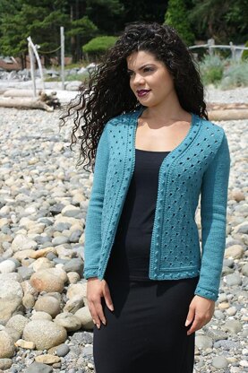 What’s Up is the fresh, fun style of this sweet open cardigan featuring eyelet polka dot lace on the fronts and back, trimmed with bands of bobbles and garter stitch. Offered in two lengths, Mid-Hip (Reg) and Mid-Thigh (Long), it is worked in one piece to the armholes. The front bands are knit along with the body and extend up around the neck, meeting at the centre back.