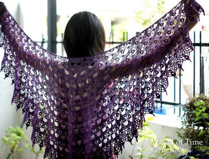 Wheel of Time is a beautiful crescent /almost circular shape shawl that both enjoyable to make and easy to wear. This shawl is designed with fingering weight yarn in mind, but there is no reason why you could not crochet it in a lighter weight yarn as long as adjust your yardage and hook size.