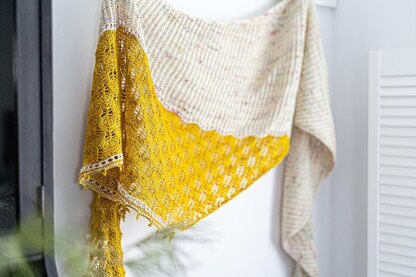 This design was inspired by and created to pay homage to the beautiful Ntozake Shange and highlight her beautiful message from her choreopoem named the same. When the Rainbow is Enuf is knit side-to-side from cast-on edge to bind-off edge to create an easy-to-wear off-center triangle shape that can be styled many ways. Work your way through rhythmic two-color brioche and a leaf lace pattern that is framed by eyelet stripes. Finally, you’ll add a dainty and stretchy picot bind-off. Let’s celebrate Ntozake’s timeless message as we cast on When the Rainbow is Enuf!