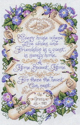 Designed by: Sandy Orton. \nHeart-warming, "Home Sweet Home" and Morning Glory Sampler. Sandy Orton brightens the day and the home with this parchment-like sampler in Counted Cross-Stitch. This verse and design by the artist, reads "Every house where love abides and Friendship is a guest, is surely home, A Home Sweet Home. For there the heart can rest".