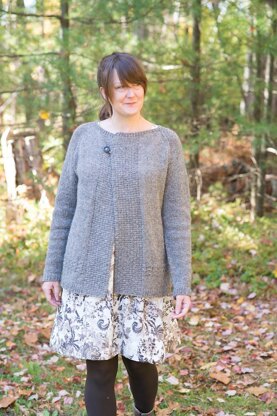 Whimbrel is worked from the top down in one piece with basketweave panels on each front and down the center back. A simple knit and purl texture pattern is worked as a horizontal detail towards the bottom of the piece. I put the button on the side that is opposite of traditional, however because a crochet loop is used as the closure, you may simply sew it onto the other front if desired:)