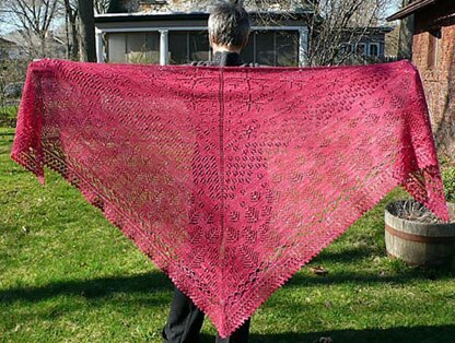 Recommended for handpainted yarns with subtle color variations. Substituting yarn and needles may result in a variation in finished shawl size.