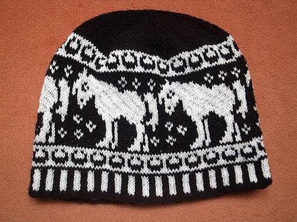 This is the perfect beanie for horse lovers and my this year’s christmas pattern!  It has 5 really BIG and beautiful white horses on it!  They are bordered by a nice horseshoe pattern.  And there are snowflakes between the horses!  So let’s call this beautiful horse “snowflake”. ;-)