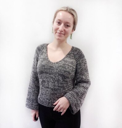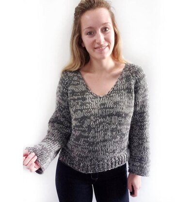 The White Noise Sweater is designed to be a simple, cozy V-neck sweater that has a unique marled effect due to the use to a bulky and lace yarn held together. It has a V-neck front and is worked top down. The sleeves are a straight sleeve that results in a slight flared look at the bottom. The bottom hem is a 1x1 ribbed hem, and features a short side split hem. The sweater is designed to fall to a long crop level. It is a #sizeinclusive design.