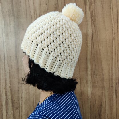 Easy crochet hat made using only single and double crochets. This beanie makes a good present for friends and family to keep warm this winter. It can be made in any other color. This chunky hat works up fast and is fun to make! No seaming is needed. It is a bottom up hat with ribbing with an option for adding pompom.