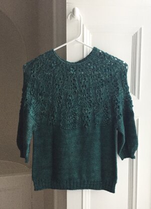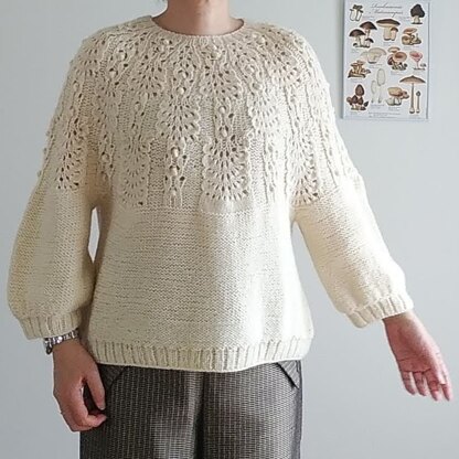 Whitehorse features a lace yoke pattern and is designed to hit at the natural waist and elbows with a slightly oversized fit. The lace yoke is knitted first, and then you switch to knitting inside out for the body and sleeves.
