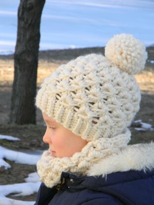 This hat and cowl set was designed during East Coast blizzard of 2016. We were completely snowed in, with piles of soft snow all around us. Knitting this pretty set makes you feel warm and cozy.
