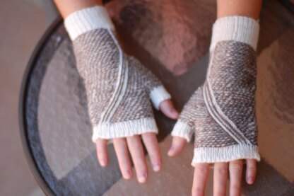 Two-color textured mitted with paths of slipped stitches that wind and wend across the hand.